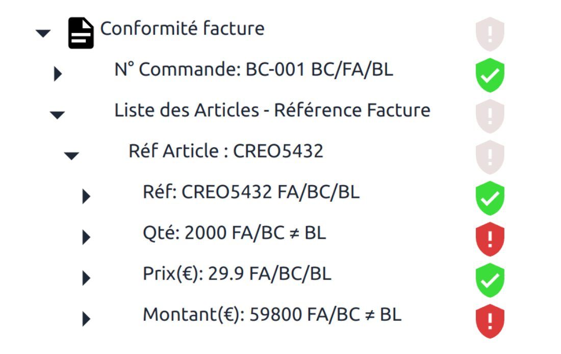 paxpar compares the data entered on the 3 PO/DN/inv. documents and therefore detects the modified quantity on the Delivery Note.